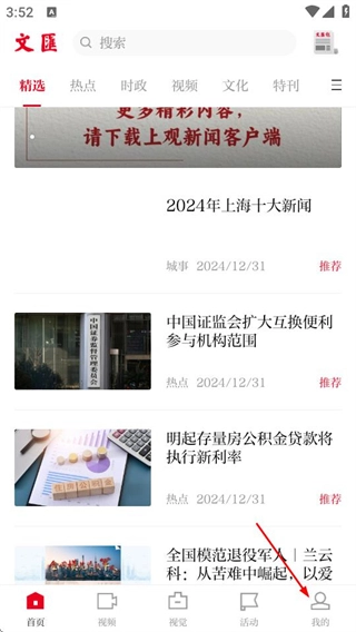 打开文汇应用后,在首页找到页面右下角的“我的”按钮并点击,即可进入个人中心页面。