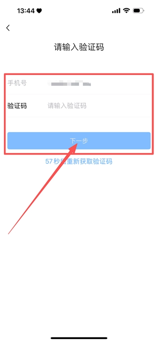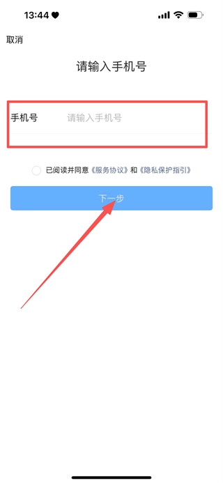 在手机号输入界面,填写好手机号并同意相关条款后,点击“下一步”按钮。