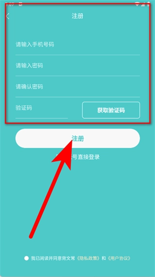 请按顺序填写手机号码、密码及确认密码,勾选同意相关协议后,点击注册按钮,即可完成注册流程。