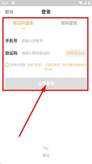 请输入手机号与验证码,随后点击“立即登录”按钮,即可完成登录流程。