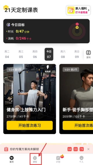 打开健身类别,点击底部的课程选项,进入课程推荐页面。