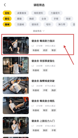 在课程筛选页面,找到并点击“健身房-臀肩耐力强训课程”,即可进入该课程的详情页面。