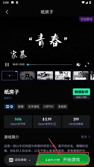在游戏详情页面,点击“4金币/分钟开始游戏”按钮,即可开启该游戏的体验之旅。