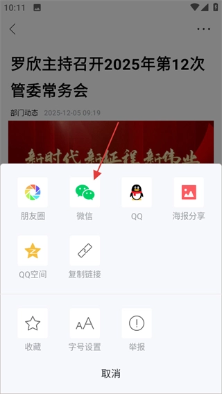 在分享菜单中,选择微信,即可将新闻分享到微信。