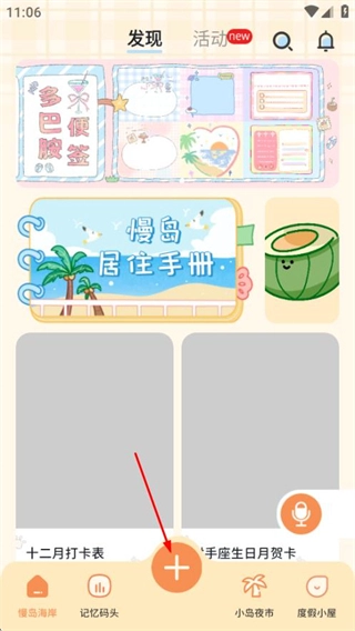 在慢岛首页,点击底部的加号按钮,即可进入功能选择页面。