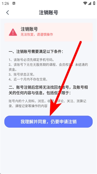 在注销账号的页面上,仔细阅读相关提示信息后,点击“我理解并同意”选项,接着选择“仍要申请注销”,最后提交注销申请即可。
