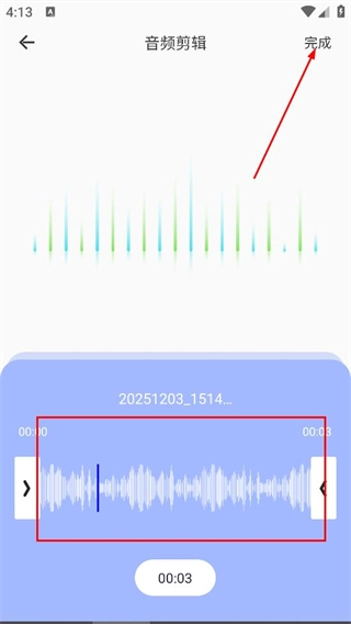 拖动剪辑区域的滑块,调整出你想要保留的音频片段范围后,点击右上角的“完成”按钮,即可完成音频剪辑操作。