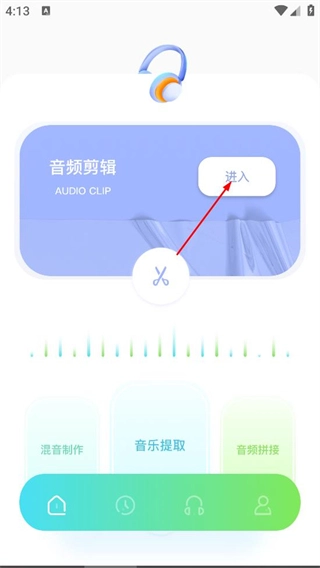 在音频首页,点击音频剪辑模块右侧的“进入”按钮,即可进入选择音乐页面。