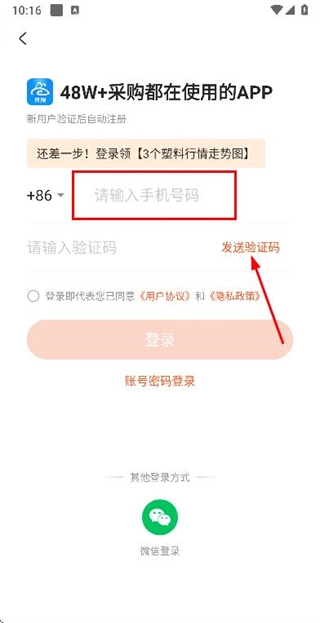 在登录页面输入手机号,勾选相关协议后,点击“发送验证码”按钮。