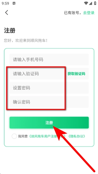 打开顺风拖车应用,待弹出相关窗口后,点击“同意并接受”按钮,即可进入登录界面。
