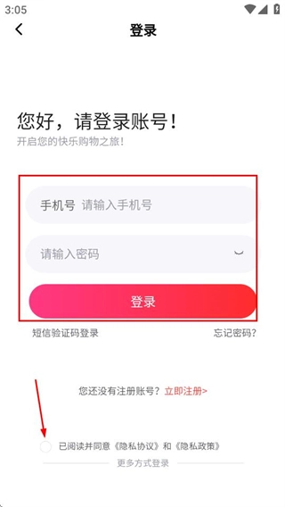 在登录页面输入手机号和密码,勾选相关协议后点击登录按钮,即可完成登录操作。