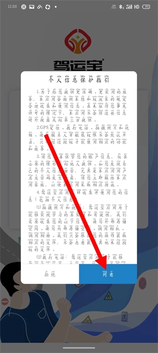 打开驾运宝应用,待弹窗出现后点击“同意”按钮,随后进入账号密码登录界面。