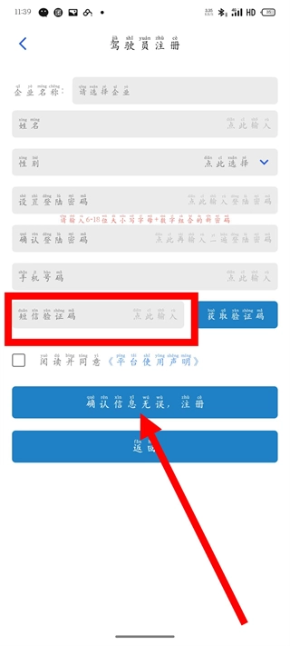 在驾驶员注册界面,填写从业资格信息,设置密码与手机号码等内容后,点击获取验证码按钮。
