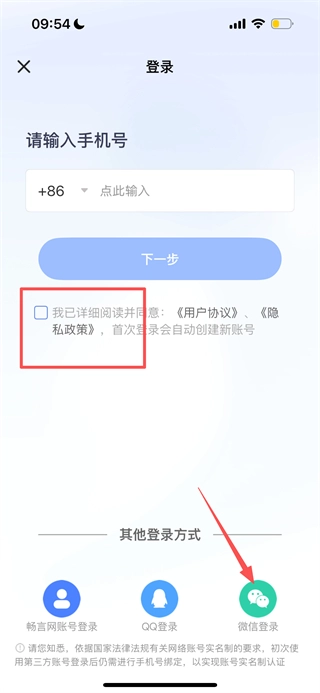 在登录页面挑选登录方式,勾选相关协议后,即可完成登录流程。