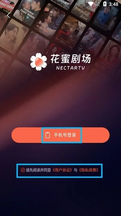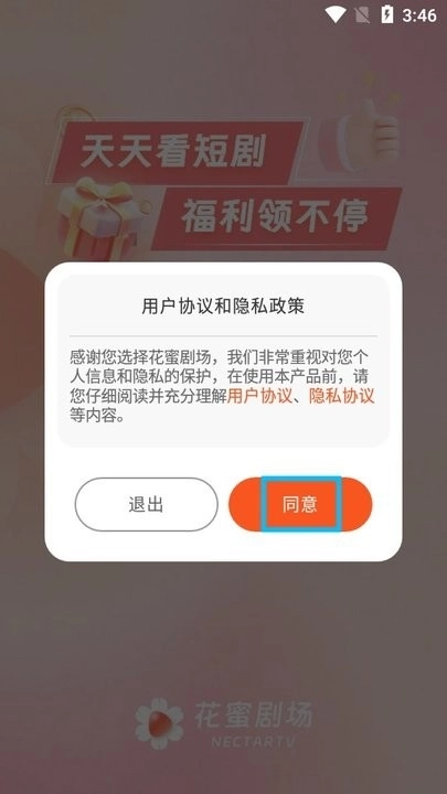 打开花蜜剧场后,仔细阅读弹出的用户协议与隐私政策,随后点击【同意】按钮。