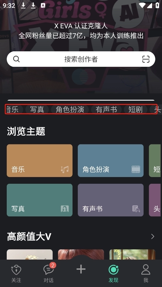 1、进入XEva软件,点击发现板块,会看到音乐、写真、有声书和头条的功能模块。