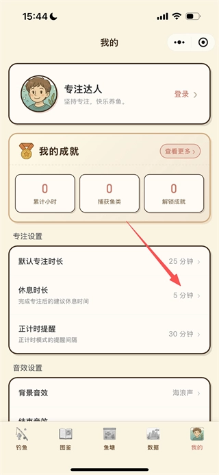 在个人中心页面,点击休息时长选项,就能打开选择休息时长的弹窗。