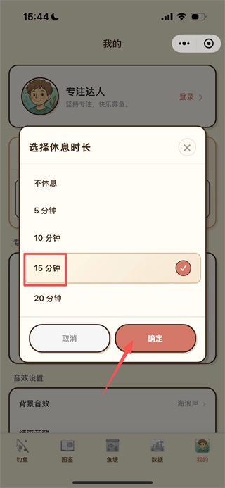 在休息时长弹窗里,选定目标时长后点击确定按钮,就能完成休息时长的设置。