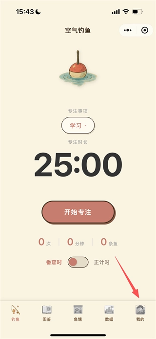 进入空气钓鱼后,点击底部的“我的”选项,就能进入个人中心页面。