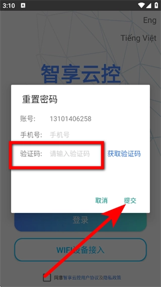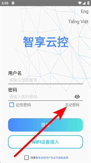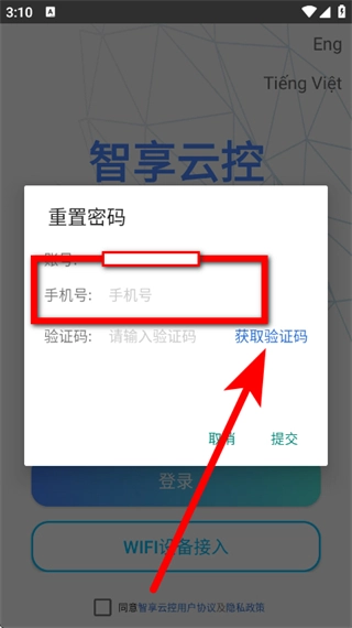 在智享云控的登录界面,点击“忘记密码”选项后,会弹出用于重置密码的弹窗。