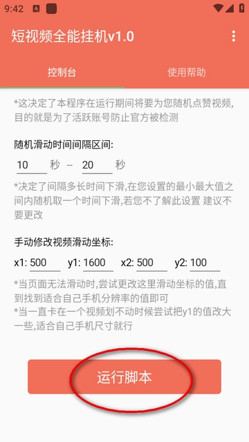 4、还能自主设定点赞的频率、屏幕滑动的时间间隔以及滑动轨迹的坐标等各项参数。等所有参数都设置妥当后,只需点击运行脚本,就能完成自动化操作了。