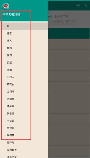 启动世界名著精选后,点击左上角的目录图标,即可展开完整的书籍分类列表。
