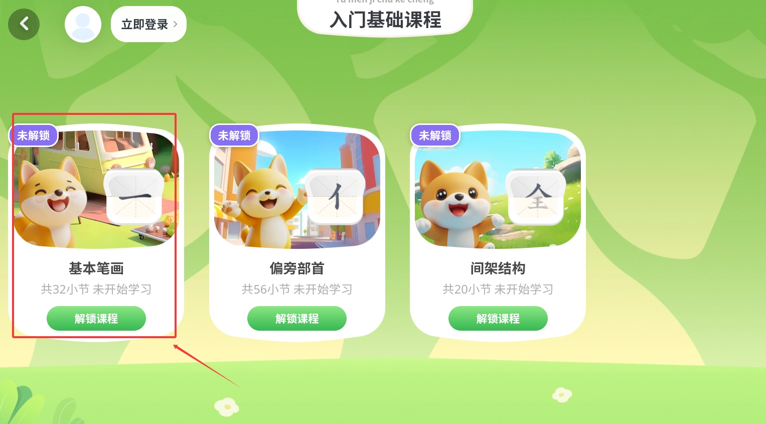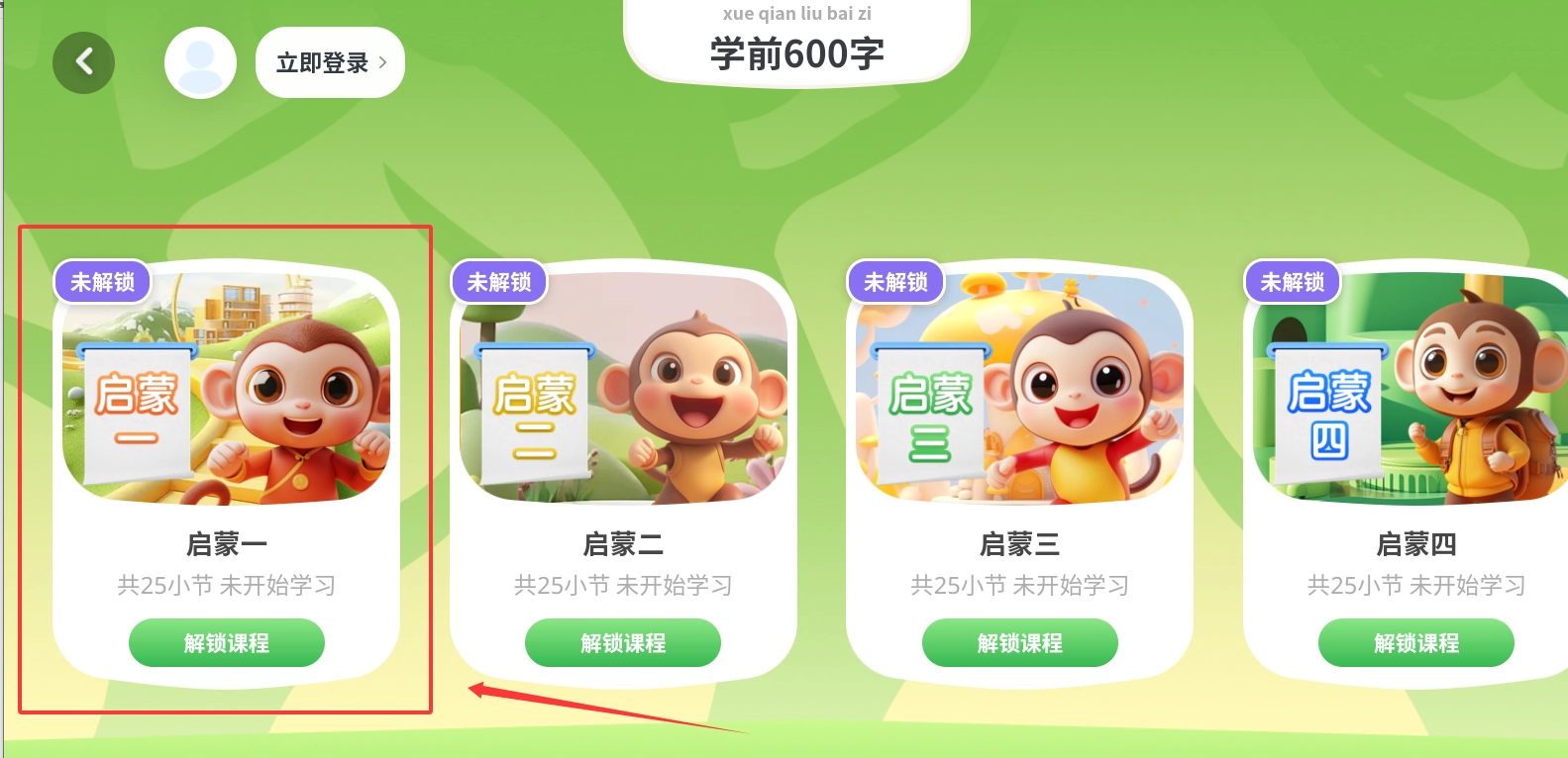 完成学前600字的学习内容后,需要登录账号来解锁后续课程,您只需根据提供的选项选择下一步的学习内容即可继续。