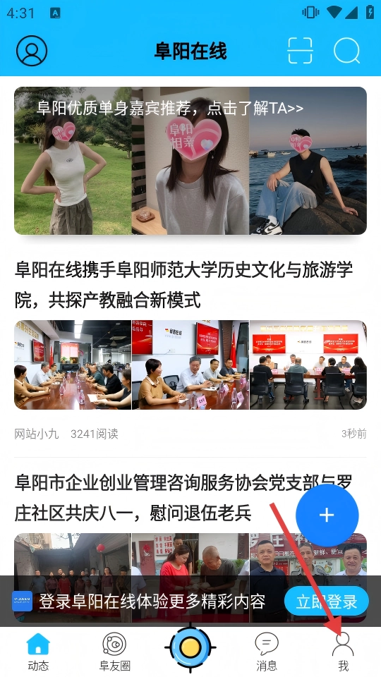 打开【阜阳在线】应用后,找到底部导航栏,点击其中的【我】选项,即可进入个人页面。