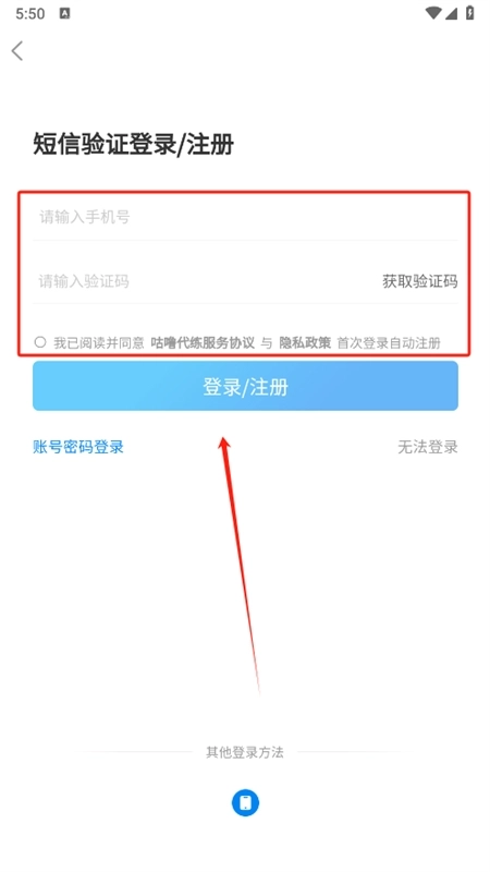 3、输入手机号和验证码,同意相关服务协议和政策后点击登陆/注册即可