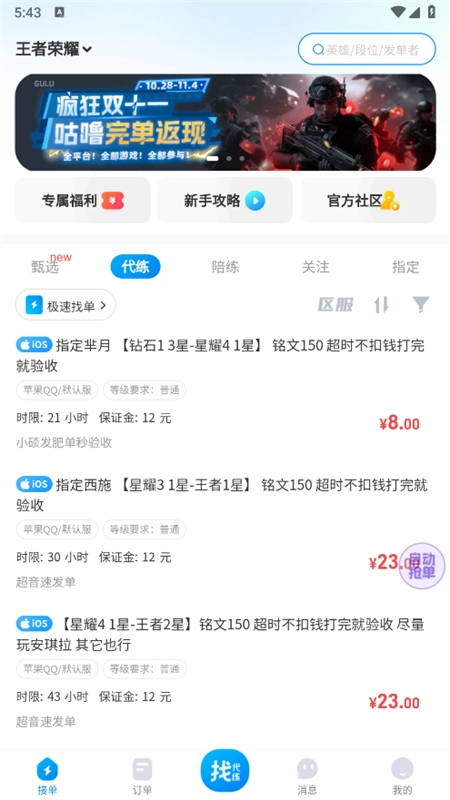 海量订单:咕噜代练平台拥有海量高价订单,供代练和陪练选择。这确保了代练和陪练有足够的订单来源和收入保障。