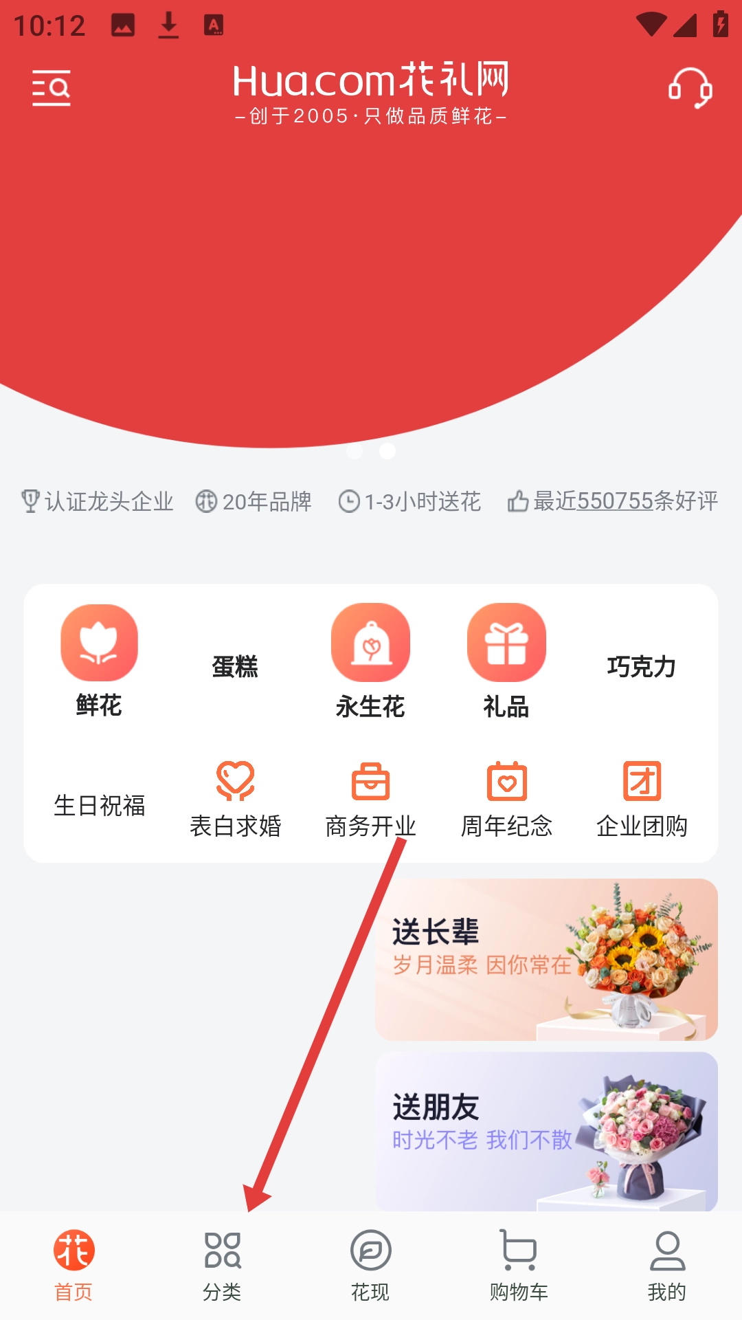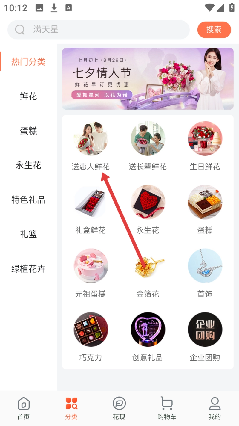 在分类页面点击【送恋人鲜花】选项,即可进入爱情鲜花的列表页面。