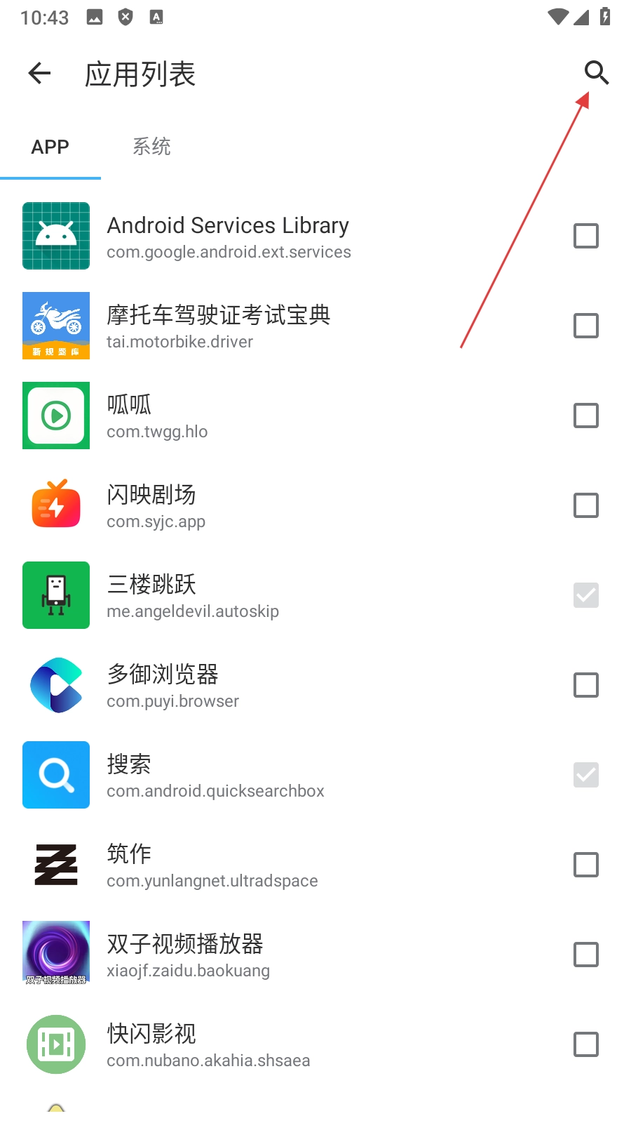 在应用列表页面【点击搜索图标】,激活搜索框。