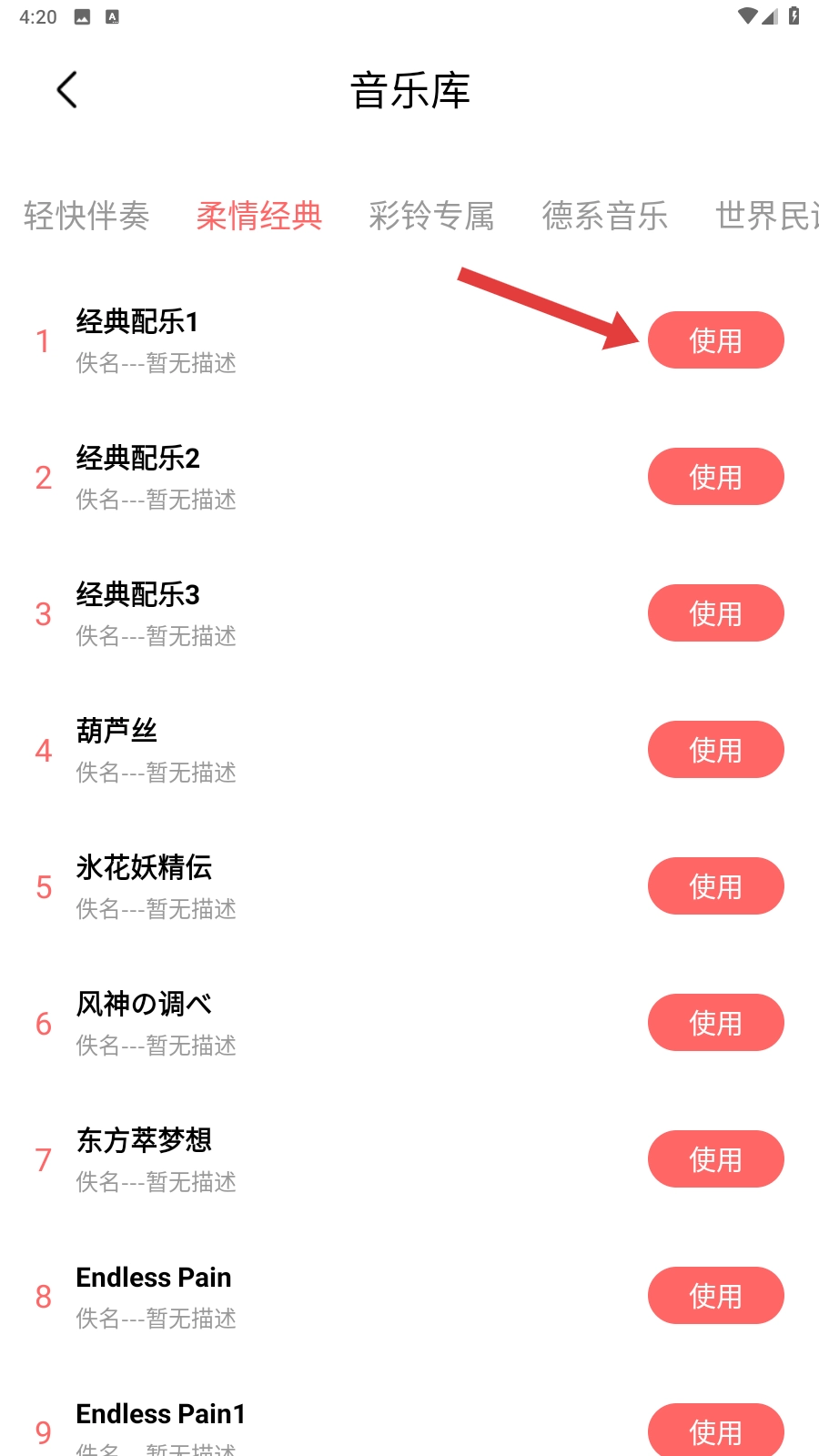 在音乐库里挑选出你喜欢的配乐,点击【使用】按钮,就能把它导入到剪切编辑界面了。