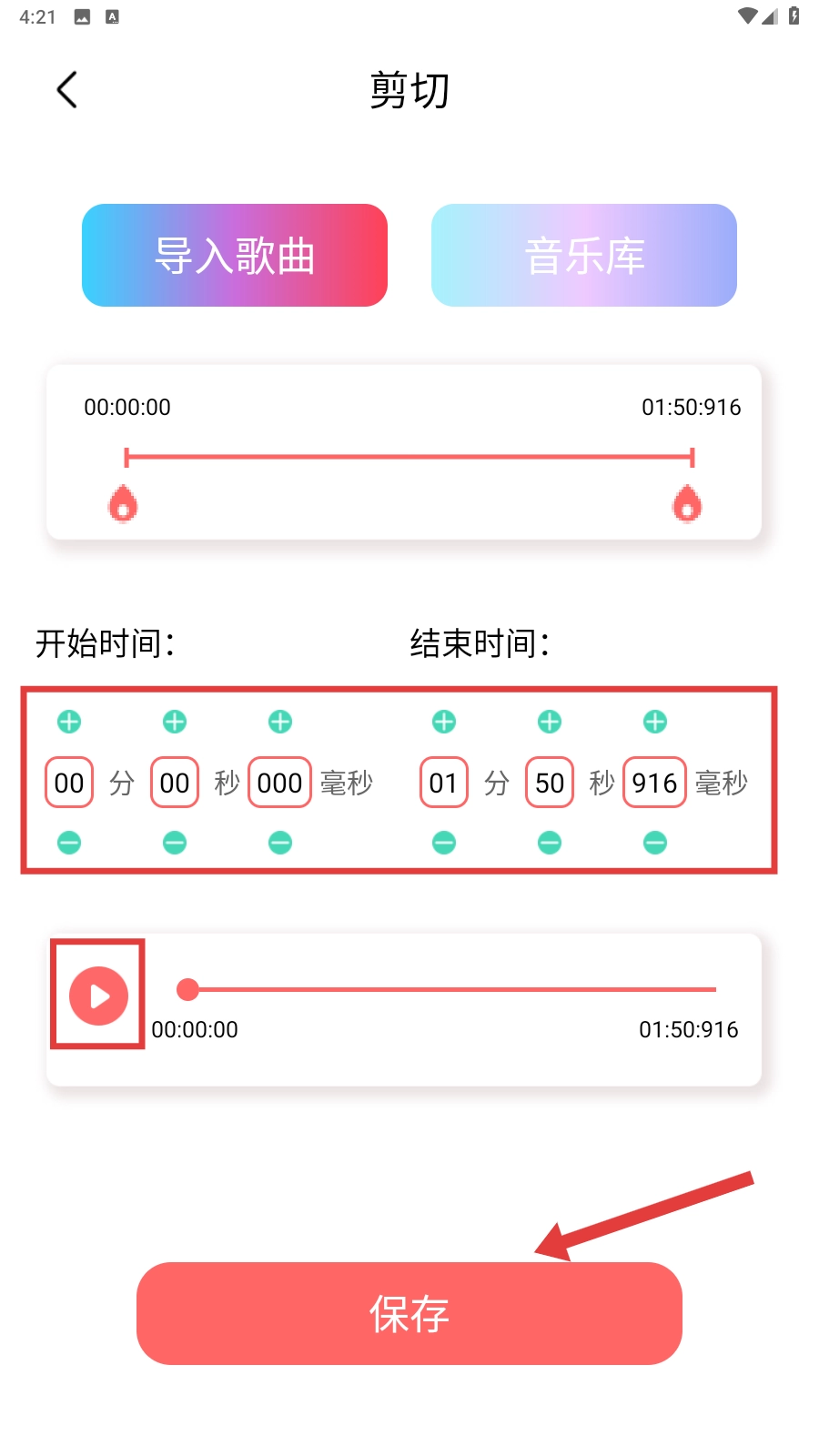 在铃声剪辑页面,把铃声的起始与结束时间调整妥当后,点击【保存】按钮,专属铃声的制作就完成啦,这样你就能拥有独一无二的铃声了。