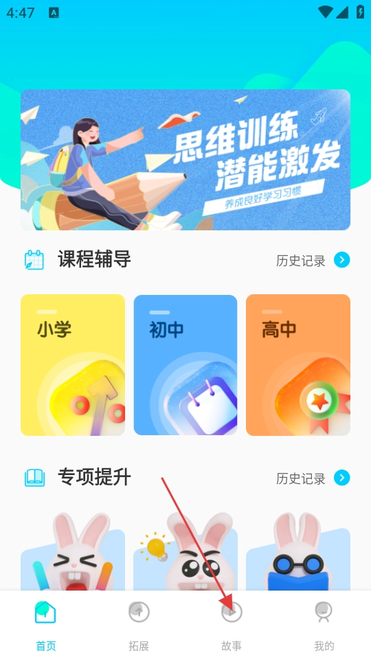 在应用的首页,点击底部的【故事】按钮,即可进入故事页面。