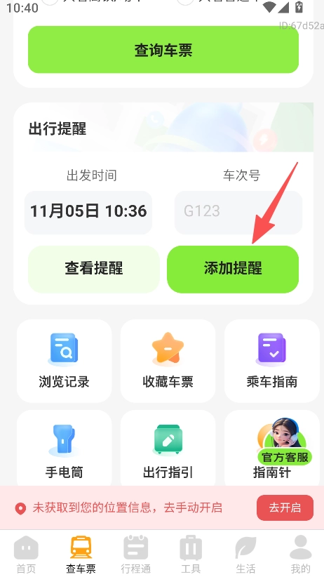打开软件后,找到并点击“添加提醒”功能,接着依次设置好具体的车次信息与发车时间,完成出行提醒的添加操作。