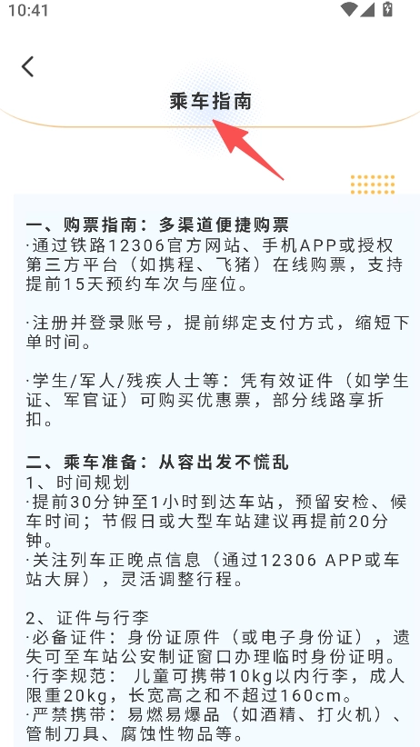乘车指南内容详实,包含购票渠道、乘车准备等相关知识,出行知识全面覆盖,能让用户充分做好出行准备。