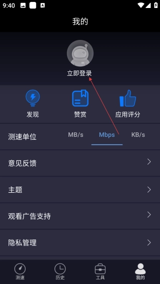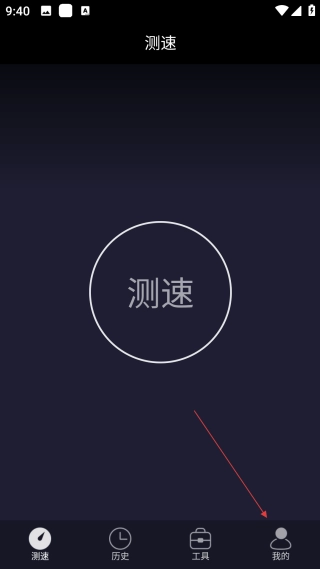 在测速主界面,点击底部的【我的】选项,即可进入个人中心操作页面。