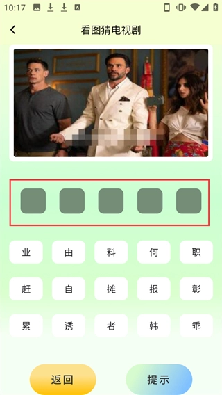 在看图猜电视剧的答题界面,把对应的文字选出来填到空格处,就能完成这一关卡的猜剧答题步骤。