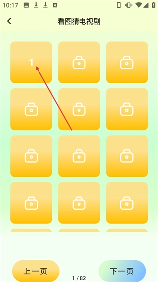 在关卡选择界面,点击与第1关对应的按钮,就能进入该关卡的看图猜剧答题界面。