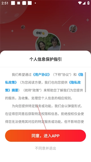 进入应用时会弹出《个人信息保护指引》,需要点击“同意,进入”按钮,确认该协议后才能进入应用。
