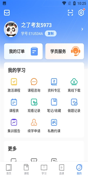 点击“我的”就能看到我的学习功能,这里包含课程激活、课程咨询、资料专区等内容。