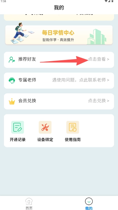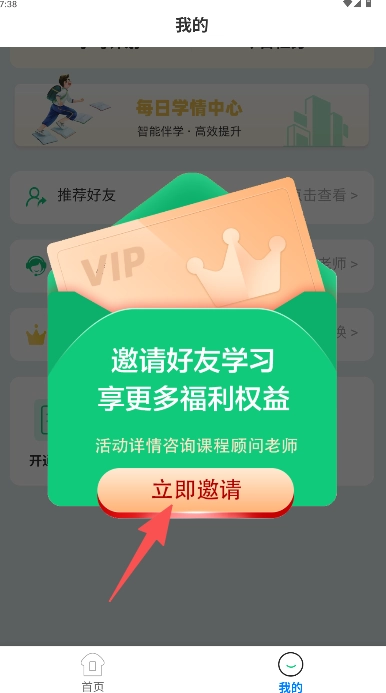 整合了教师沟通与好友推荐功能,既支持和专属教师在线互动交流,也能通过邀请好友来获取学习权益。