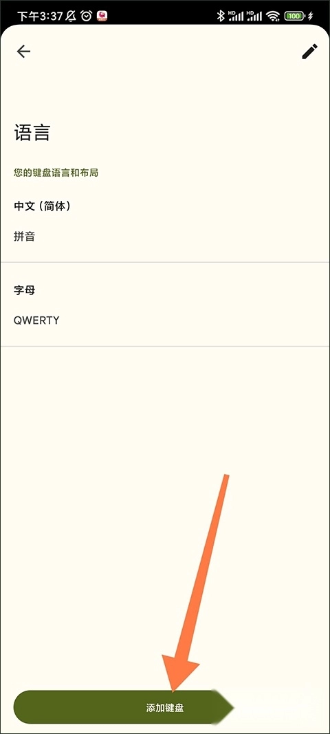 2、进入语言界面后,能看到当前已设置使用的2种语言,此时点击最下方的“添加键盘”按钮即可。