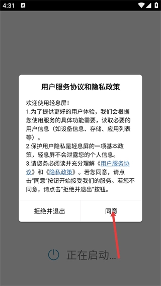 开启轻息屏后,请阅读《用户服务协议》与《隐私政策》,随后点击【同意】按钮,即可进入应用主界面。
