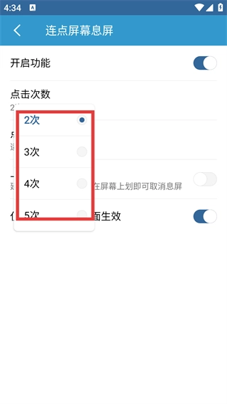 在次数选择弹窗里,能够挑选2次、3次之类不同的点击次数,自行设定息屏的触发条件。