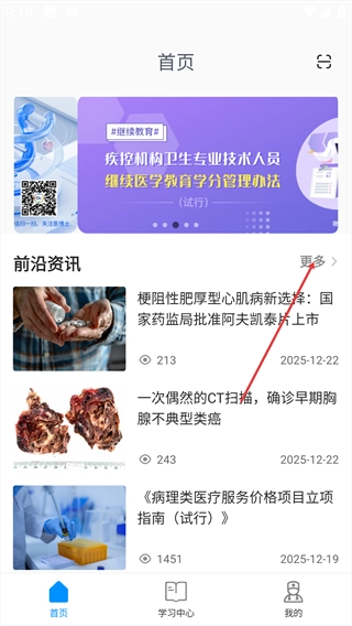在首页的【前沿资讯】板块,点击右上角的【更多】按钮,即可查看更多医疗相关的资讯内容。