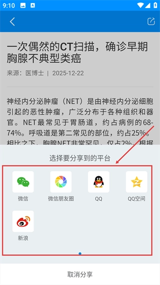 打开分享菜单后,可在【微信】【QQ】等平台中进行选择,以此完成这篇医疗资讯文章的分享操作。