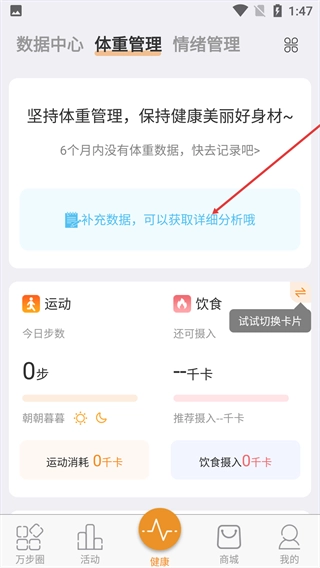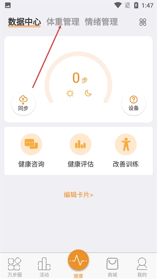 在健康页面中,点击顶部的【体重管理】选项,即可切换到体重管理功能页面。