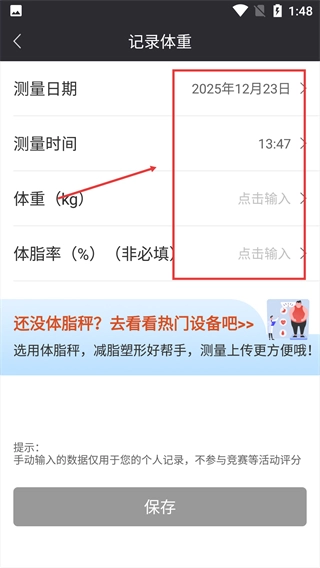 点击【补充数据,可以获取详细分析哦】这个区域,就能进入体重数据的操作页面。